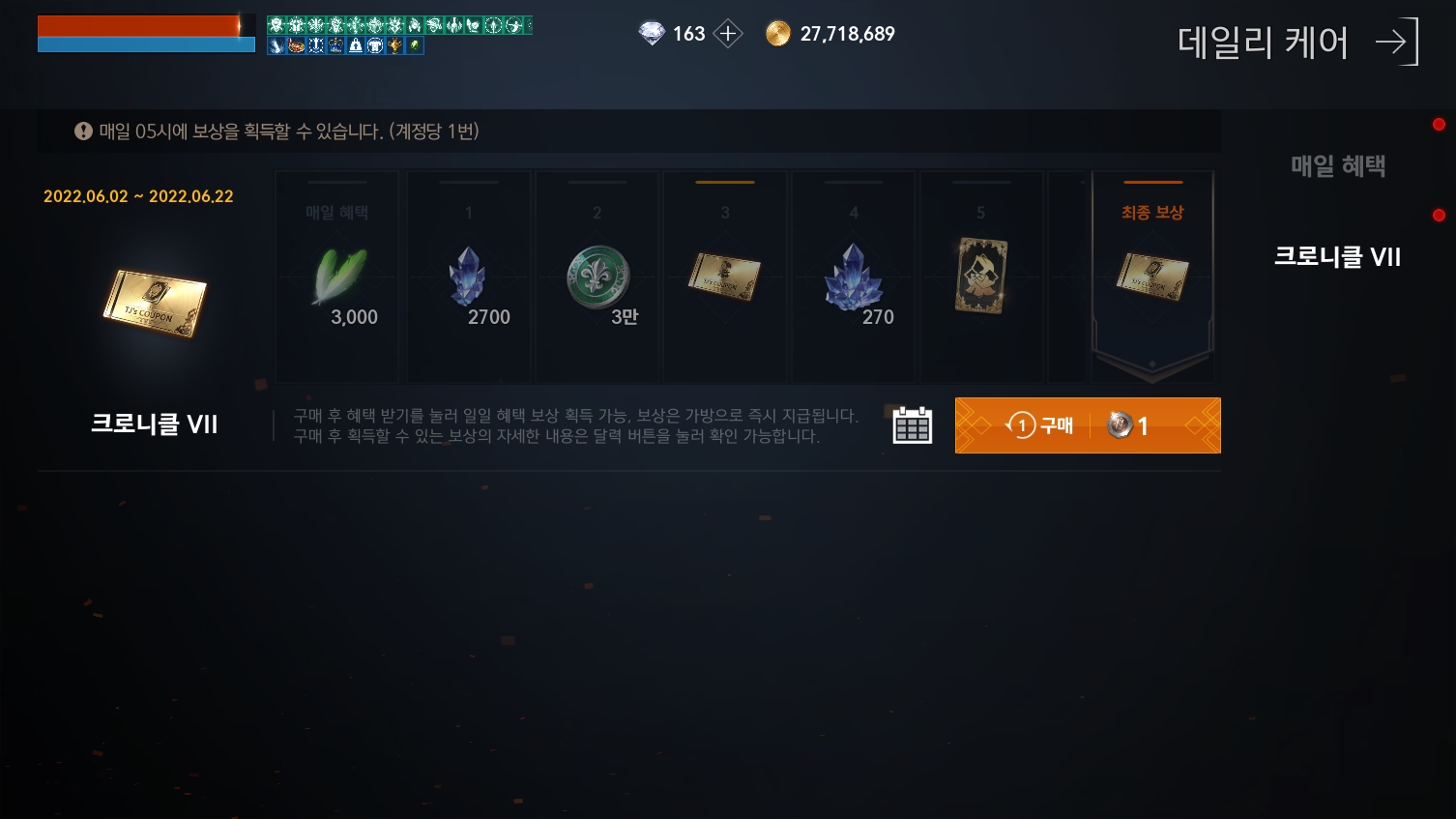 데일리 혜택을 얻을 수 있는 방법은 크로니클VII 기념 주화를 700아데나에 구매해서 오픈하면 됩니다.