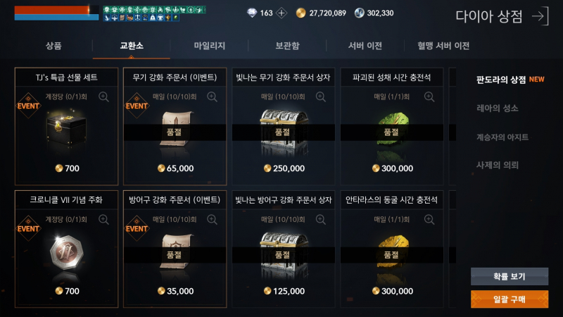 현재 특급 선물 세트는 다이아상점> 교환소> 판도라의 상점 내에서 찾아볼 수 있으며