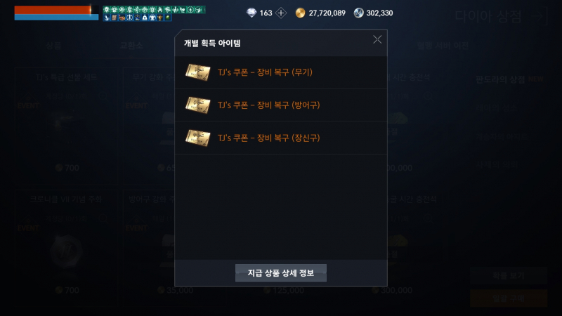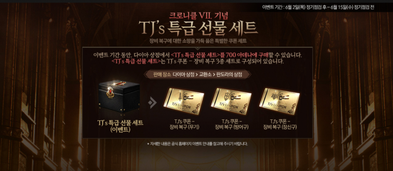 현재 특급 선물 세트는 장비복구 TJ쿠폰 3종이 들어있습니다. 무기, 방어구, 장신구 각각 1장씩 있으며