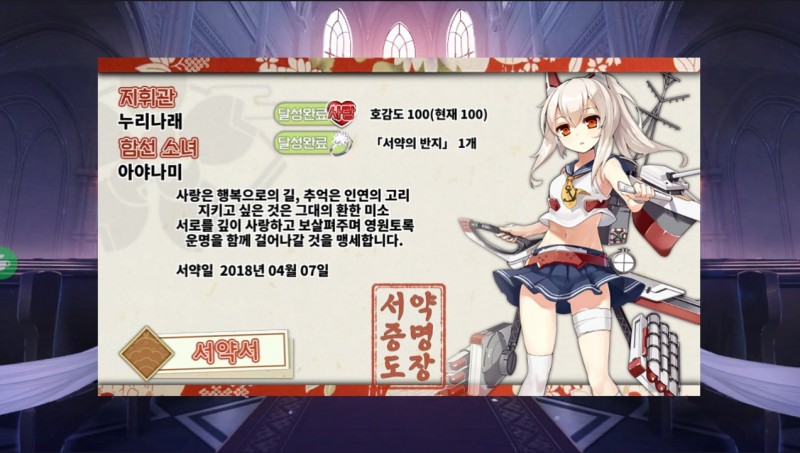 유희 저도 방금 호감도 100%! 작성일시 : 2018. 04. 07 (03:23) 조회 : 2,337 / 댓글 : 2 아야나미랑 서약한...ㅎㅎㅎ 첫번째 서약이라 반지 1개는 그냥 주더군요...! 7추천 글쓰기스크랩 신고