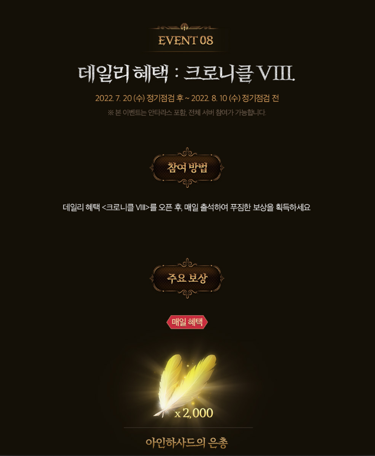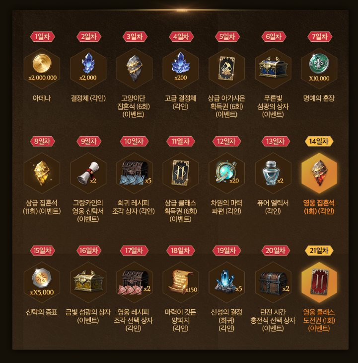 마지막 데일리 혜택<크로니클VII>를 오픈하는 것으로 매일 아인하사드의 은총X2000을 얻을 수 있습니다. 또한 1일차 아데나 보상부터 21일차 영웅클래스 도전권까지 다양한 재화와 아이템 획득이 가능하니 한번 시작해보시는 것을 추천드립니다.