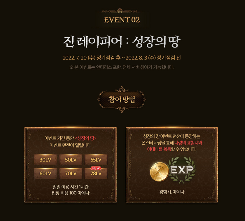 다음은 성장의 땅으로 위와 같은 기간동안 많은 양의 경험치와 아데나를 얻을 수 있는 <성장의 땅> 이벤트 던전이 열린다고 하네요 일일 이용시간은 1시간, 입장 비용은 100데나라고 합니다.