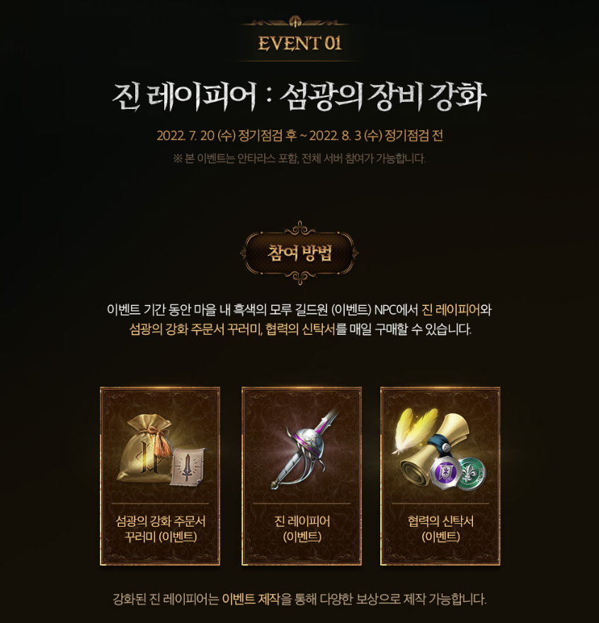 먼저 '진 레이피어: 섬광의 장비 강화'로 8월 3일까지 진행되는 이벤트 기간동안 마을에 있는 흑색의 모루 길드원(이벤트) NPC에서 진 레이피어와 섬광의 강화 주문서 꾸러미, 협력의 신탁서를 매일 구매할 수 있게 됩니다. 강화된 진 레이피어로 다양한 이벤트제작이 가능하다고 합니다.