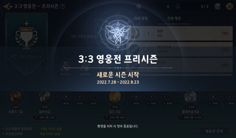 페녹시 세나레볼 새로운 컨텐츠 3:3 영웅전 작성일시 : 2022. 08. 10 (22:58) 조회 : 556 / 댓글 : 0 세나레볼 오늘 업데이트하고3:3 영웅전 새로 생겼는데 시즌별로 진행되고한명 영웅 선택해서 출전 시킬 수 있어요매칭하거나 친구랑도 할 수 있어서 좋은거같아요 ㅋㅋ전 루디출전 시켰는데 방패진격이 진짜 잘먹혀요 이번에 가방슬롯 확장시켜준댔는데100개에서 200개로 늘려주고400개까지 확장 가능해요 ㅋㅋㅋ저도 필요해서 한번 확장했는데 괜히한듯?ㅋㅋㅋ 1추천 글쓰기스크랩 신고