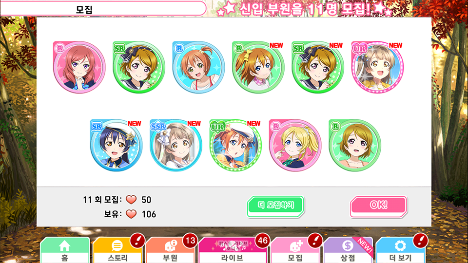 야자와 니코 러브라이브 글쿠패스 외) 작성일시 : 2018. 04. 08 (23:23) 조회 : 2,564 / 댓글 : 5 요즘 소전, 벽람 등등 많은 게임에 대한 글이 보여 저도 올려봅니다.저도 소전과 벽람 같이 즐기고 있습니다. 러브라이브 글쿠패스 하는데 제일 뽑고싶었던 니코 SSR이 나왔어요!그리고 다음 가챠는 한번에 UR두개, SSR 한개가 동시에 나왔어요! ㅎㅎ 소전에서는 10-4E를 42트만에 XM3가 나와줬어요! 감사합니다! 6추천 글쓰기스크랩 신고