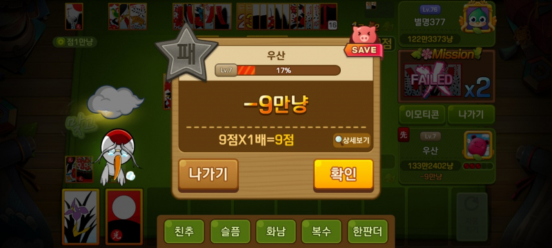 오랜만에 피망뉴맞고 플레이 중인데 시작부터 8점이나 뺏기고 다음판에서도 져버렸습니다...ㅎㅎ