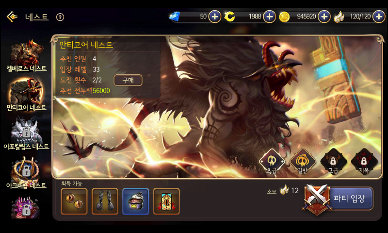 켈베로스 고급보다 만티코어 초급이 더 쉽게 클리어가능하고 더 놓은 세트를 만들수 있어서 만티코어 초급을 추천드립니다.