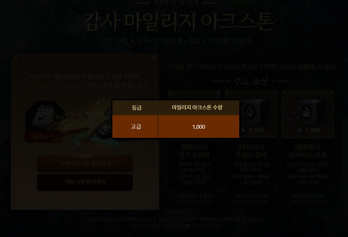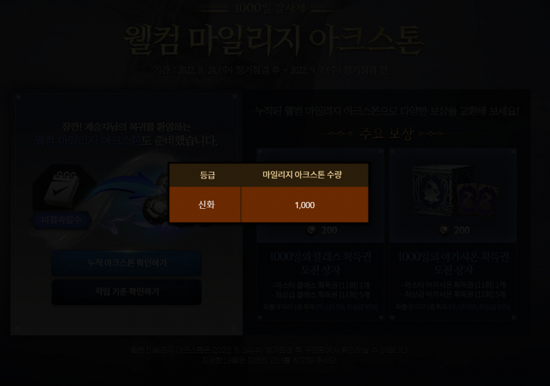 명혼 이전에 린투엠 조금이라도 하셨다면 확인해보셔야 하는 거 작성일시 : 2022. 08. 19 (00:21) 조회 : 512 / 댓글 : 0 감사/웰컴 마일리지 아크스톤이번 마일리지 아크스톤은 지급 방식이 상당히 독특한데 감사 마일리지 아크스톤은론칭 후부터 캐릭터 생성일을 기준으로 접속일수가 많으면 더 많이 주고,웰컴 마일리지 아크스톤은 미접속일수가 많으면 더 많이 주는 독특한 방식입니다그래서 저처럼 할 때 오래 하고, 쉴 때 오래 쉬면 위처럼 둘 다 받을 수 있는거죠 ㅋㅋ근데 혜택은 상당히 좋아서 내심 기대중인데이전에 린투엠 계정 생성만 해뒀어도 혜택 노려볼 수 있으니까한번 확인해보시는 거 추천합니다 1추천 글쓰기스크랩 신고