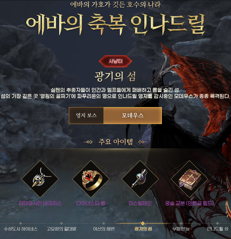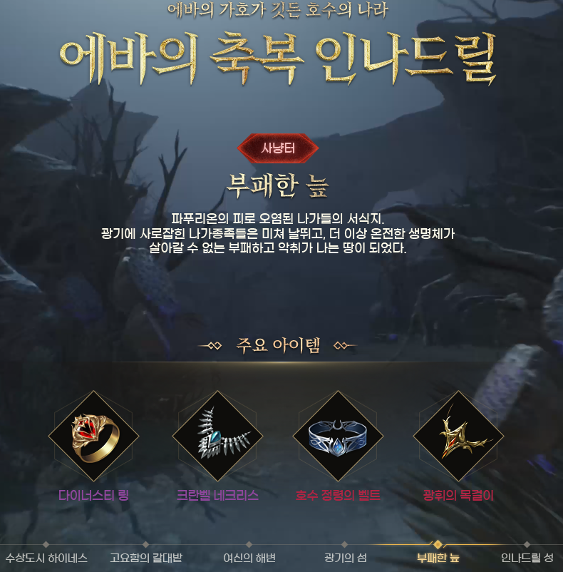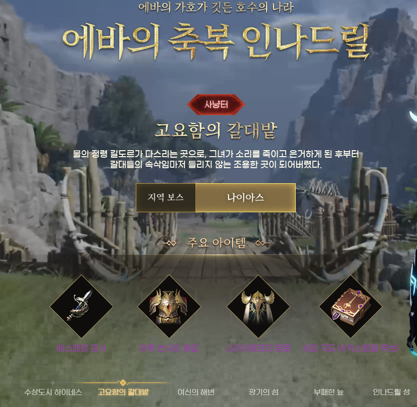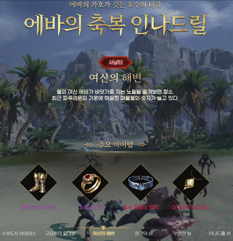 이번 신규영지 인나드릴에는 '고요함의 갈대밭', '여신의 해변', '광기의 섬', '부패한 늪' 총 4군데의 사냥터와