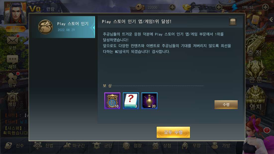 치토스 MZ 삼국지 출시했어요. 작성일시 : 2022. 08. 29 (17:04) 조회 : 523 / 댓글 : 1 MZ 삼국지라고 신작 삼국지 겜이 출시했는데그랜드 오픈 기념으로 전설급 장수도 뿌리고 스토어 인기 앱 1위 달성했다고보상도 많이 챙겨주던 ㅋㅋ 뭐 게임도 관문 밀면서 보상 받고장수들 스킬 쓰고 생각보다 재밌었습니다. 2추천 글쓰기스크랩 신고