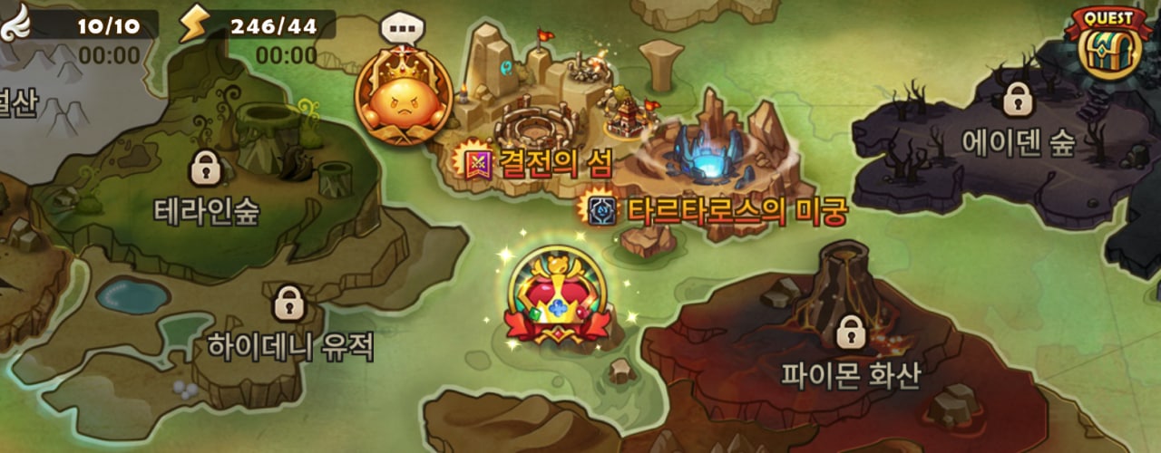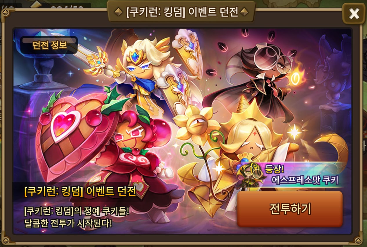 전투에서 지도의 하이데니 유적와 파이몬 화산 사이에 이벤트 던전 하나가 추가된 것을 확인하실 수 있는데요, 바로 [쿠키런: 킹덤]이벤트 던전입니다. 어제는 홀리베리 쿠키가 등장했었는데 오늘은 에스프레소맛 쿠키가 등장하네요
