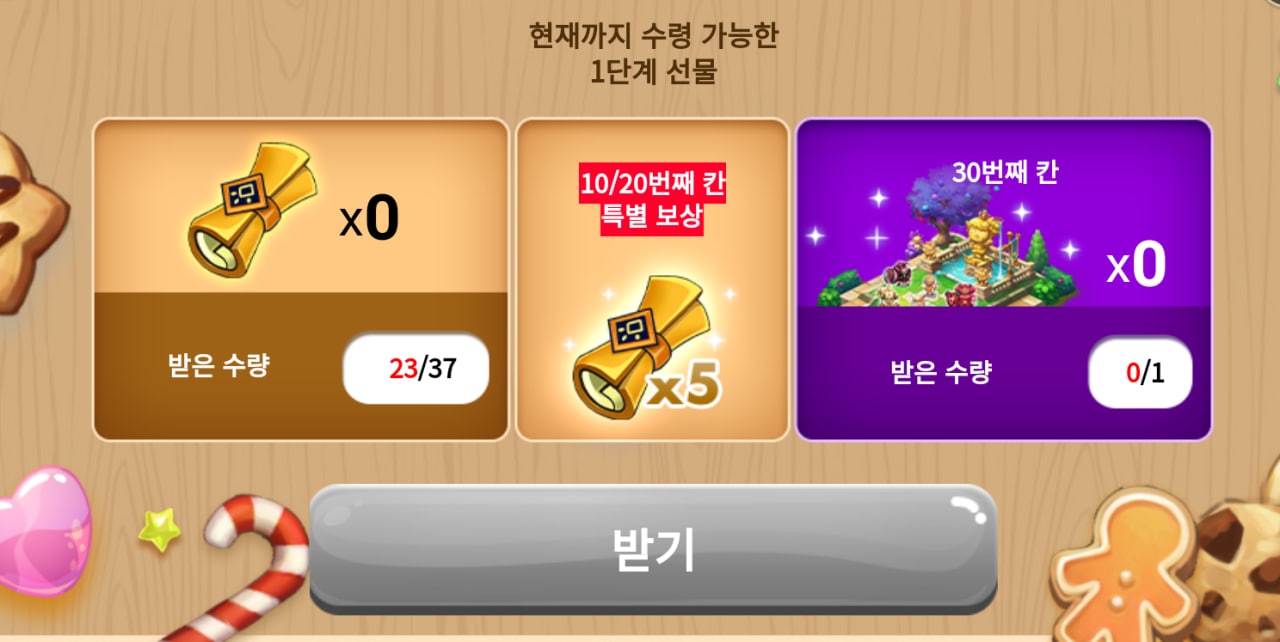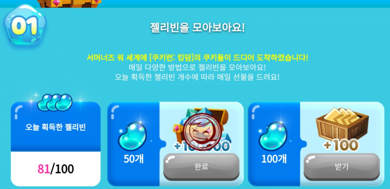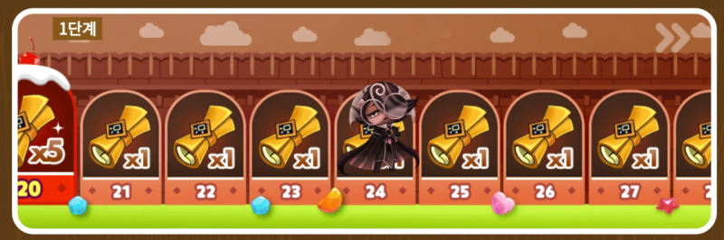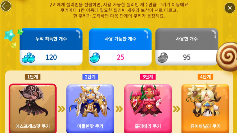 위의 열기구와 이벤트 던전에서는 젤리빈도 추가로 얻을 수 있게 되어있습니다. 하루에 얻을 수 있는 젤리빈은 최대 100개이며, 이 젤리빈을 수집하여 쿠키에게 선물하면 선물한 젤리빈 개수만큼 쿠키가 앞으로 이동합니다. 쿠키마다 1칸 이동에 필요한 젤리빈 개수와 보상이 각각 다르며 30칸까지 존재합니다. 한 쿠키가 도착하게 되면 다음 단계의 쿠키가 등장하여 단계 이동이 가능합니다. 10번쨰 칸과 20번째 칸, 30번째 칸에 특별 보상이 존재합니다.