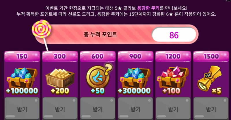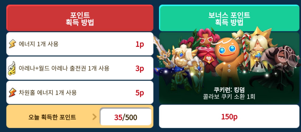 플레이를 하며 젤리빈 이외에 포인트라는 것을 획득할 수 있는데요, 에너지 1개를 사용하면 1P, 아레나+월드 아레나 출전권 1개를 사용하면 3P, 마지막 차원홀 에너지 1개를 사용하면 5P를 얻을 수있습니다. 쿠키런:킹덤 콜라보 쿠키 소환을 하면 보너스로 150P를 얻을 수 있다고 합니다. 1일 최대 500P까지 카운트하며 보너스 포인트의 경우 무한대로 카운트가 된다고 하네요. 누적 포인트를 통해 다양한 보상도 준비되어있습니다. 누적으로 2000P를 모으면 쿠키런: 킹덤 콜라보 소환수인 태생 5★ 용감한 쿠키를 얻을 수 있습니다.