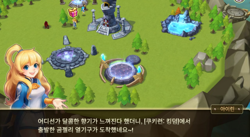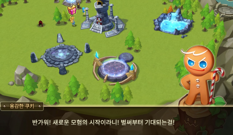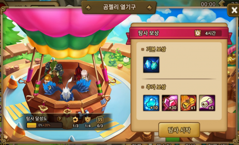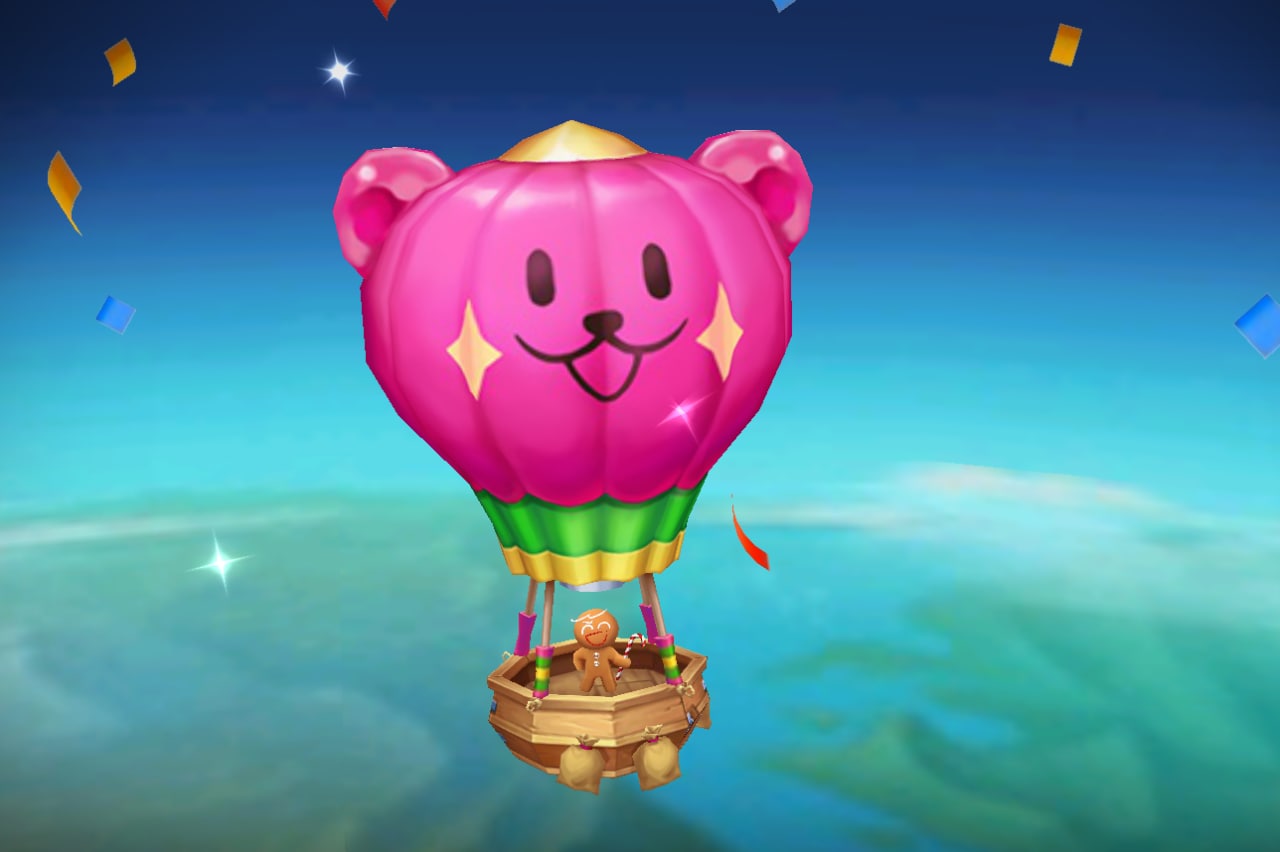 바로 게임을 시작하고 얼마 되지 않아 바로 이벤트 화면이 나오는데요, 하늘에서 곰젤리 열기구를 탄 용감한 쿠키가 내려오며 섬에서 곰젤리 열기구를 통해 쿠킹덤에서처럼 탐사를 보낼 수 있게 됩니다. 탐사를 보내두면 일정 시간 후에 인게임 보상과 함께 돌아옵니다.