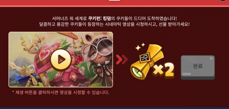 마지막으로 인게임에서 이벤트로 들어가 서머너즈워 영상을 시청하고 나면 완료 버튼을 눌러 소환서를 얻을 수 있으니 되도록 참여하여 받아두는 것이 좋을 것 같습니다.