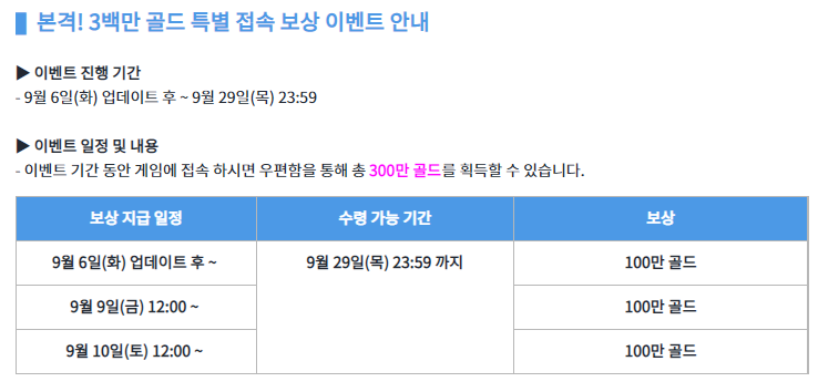 또한, 게임을 플레이하는 유저들의 니즈를 반영한 3백만 골드 이벤트도 진행하고 있는데,