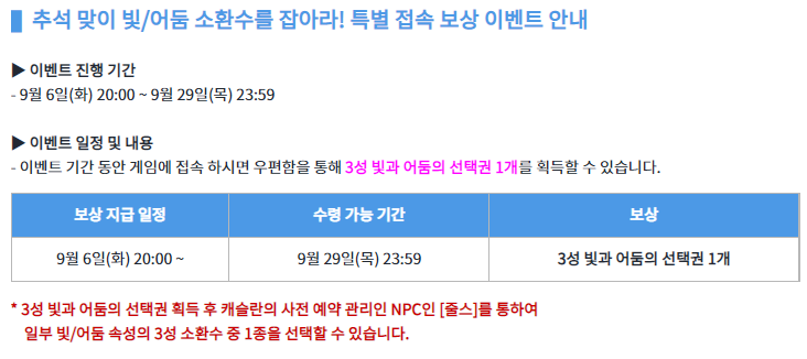 추석맞이 빛/어둠 소환수를 잡아라 이벤트는 9월 6일 업데이트 이 후 게임에 접속하면 우편함을 통해 선택권을 획득할 수 있는데요,