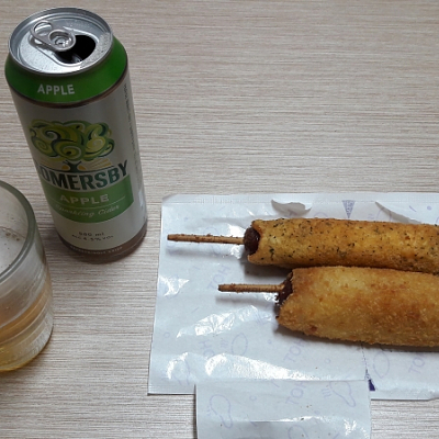야식은 맥주와 핫도그입니다.