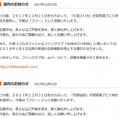 성우 쿠보 유리카, 요시노 유나, 2017년 12월 31일자로 클레어 보이스 퇴사