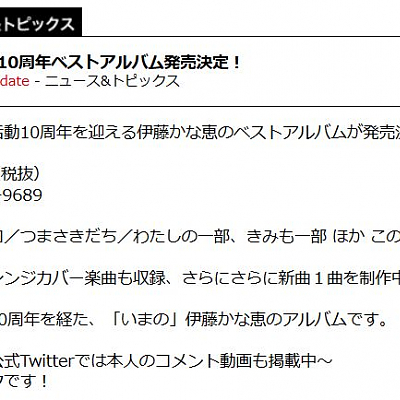 아티스트 활동 10주년을 맞이한 성우 이토 카나에의 베스트 앨범 발매 결정