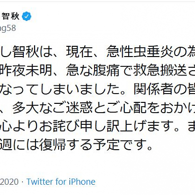 성우 다카하시 치아키시가 급성 충수염으로 입원한 모양입니다.