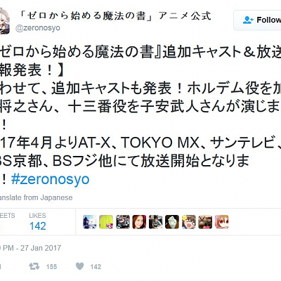 2017년 4월 신작 '제로에서 시작하는 마법의 서' 추가 성우 캐스팅