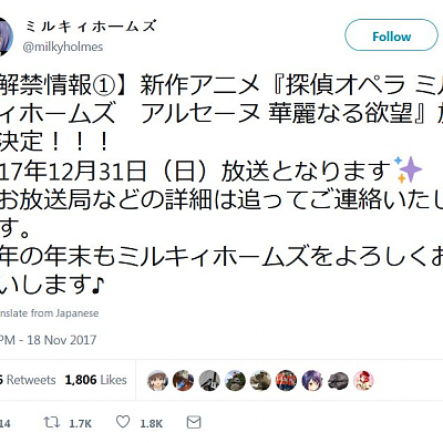 탐정오페라 밀키홈즈 신작 애니메이션 2017년 12월 31일 방송 예정