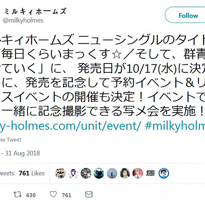 성우 유닛 '밀키홈즈'의 파이널 싱글 음반 발매일 발표