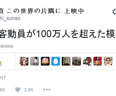 극장 애니메이션 '이 세계의 한쪽 구석에' 관객 동원 100만명 돌파한 듯