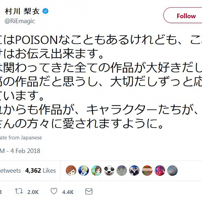 성우 무라카와 리에가 자신은 관여했던 모든 작품을 아주 좋아한다고 강조