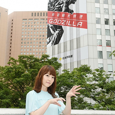 성우 하나자와 카나씨의 사진, 건물에 그려진 거대한 고질라 아트를 소개하는 모습