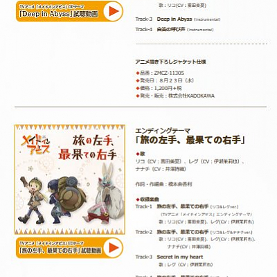TV 애니메이션 '메이드 인 어비스' OP ED 음반 관련 정보