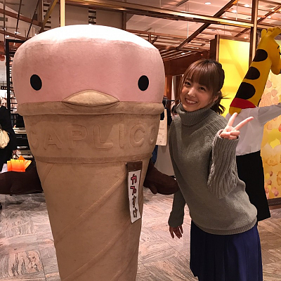 성우 카토 에미리씨의 사진, 카푸스케라는 마스코트 캐릭터와 함께