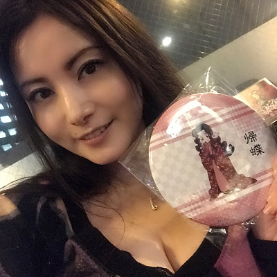 성우 다카하시 치아키씨의 사진, 노부나가의 닌자 '키쵸'의 배지를 들고