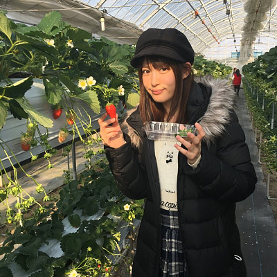 성우 코마츠 미카코씨의 사진, 딸기 수확 체험중인 모습