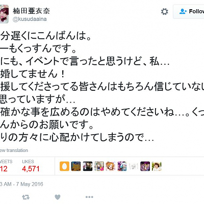 성우 쿠스다 아이나, 한밤중에 트위터에서 '저, 결혼하지 않았습니다!'