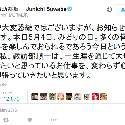 성우 스와베 쥰이치씨가 트위터에 진지하게 올린 개인적인 공지가 화제