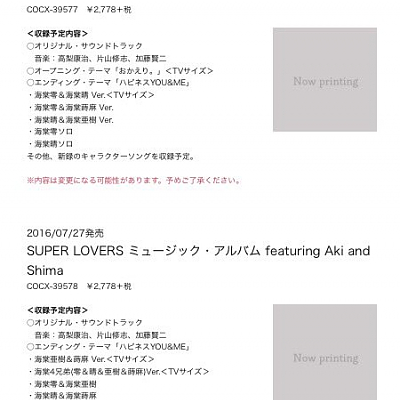 애니메이션 'SUPER LOVERS' 앨범 2장, 2016년 7월 27일 동시 발매 예정