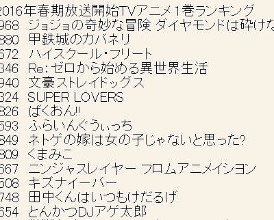 2016년 4월 신작 애니메이션 제 1권 판매량 랭킹이 나왔네요.