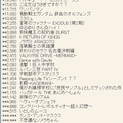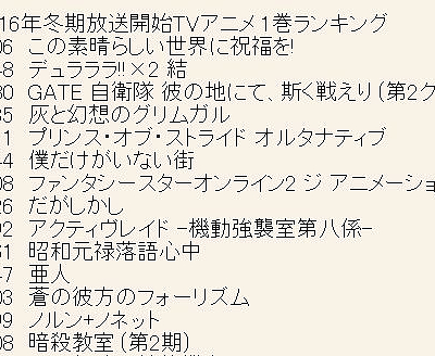 2016년 1월 신작 애니메이션 제 1권 판매량 랭킹 약간 업데이트