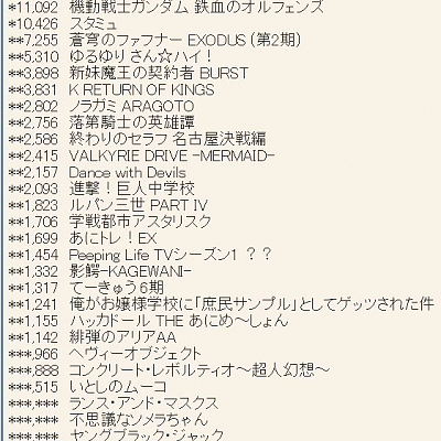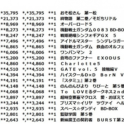 2015년 10월 신작 애니메이션 제 1권 판매량 랭킹 약간 업데이트
