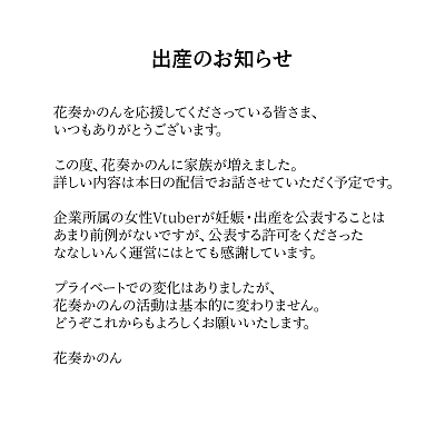 나나시잉크 소속의 버추얼 유튜버 '카나데 카논', 2024년 11월 3일 결혼과 출산 발표
