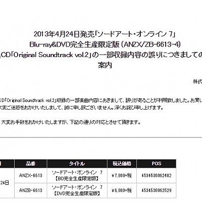 '소드 아트 온라인' 블루레이 & DVD 한정판 제 7권 특전 CD의 문제가 2년만에 발견