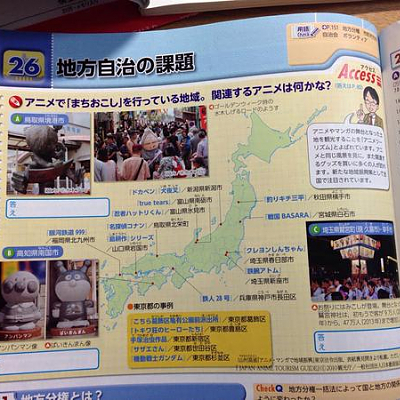 일본의 중학교 공민 교과서에 애니메이션을 이용한 지역 부흥 사례 소개