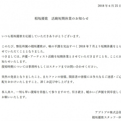 성우 아이사카 유카, 2018년 7월부터 단기 휴양