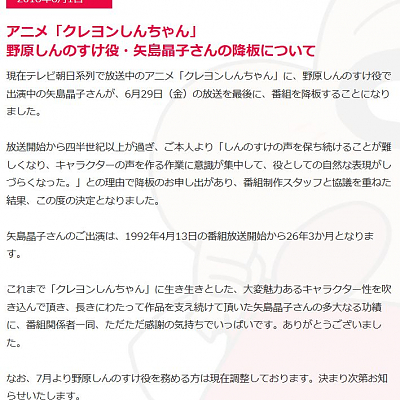 애니메이션 '크레용신짱'의 신노스케 역 성우 '야지마 아키코'씨 강판 발표