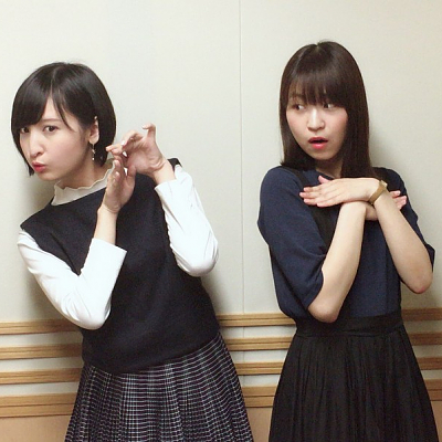 성우 사쿠라 아야네 & 오오니시 사오리의 사진, 모코탄멘 나카모토를 들고