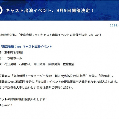 2018년 9월 9일, '도쿄구울: re' 성우 출연 이벤트 개최 결정