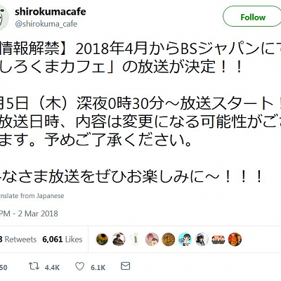 2018년 4월 5일부터 BS 재팬에서 '백곰카페' 애니메이션 방송 결정