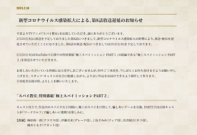 TV 애니메이션 '스파이 교실' 제 8화 방송 연기 발표, 코로나의 영향
